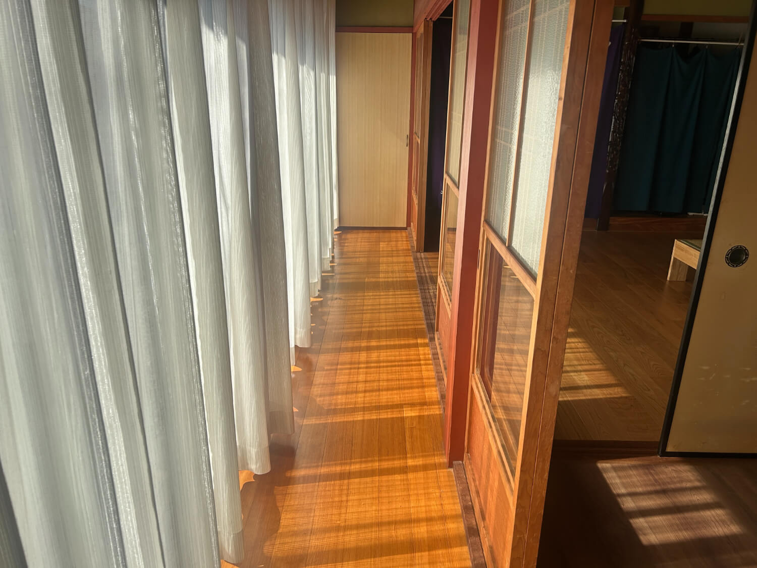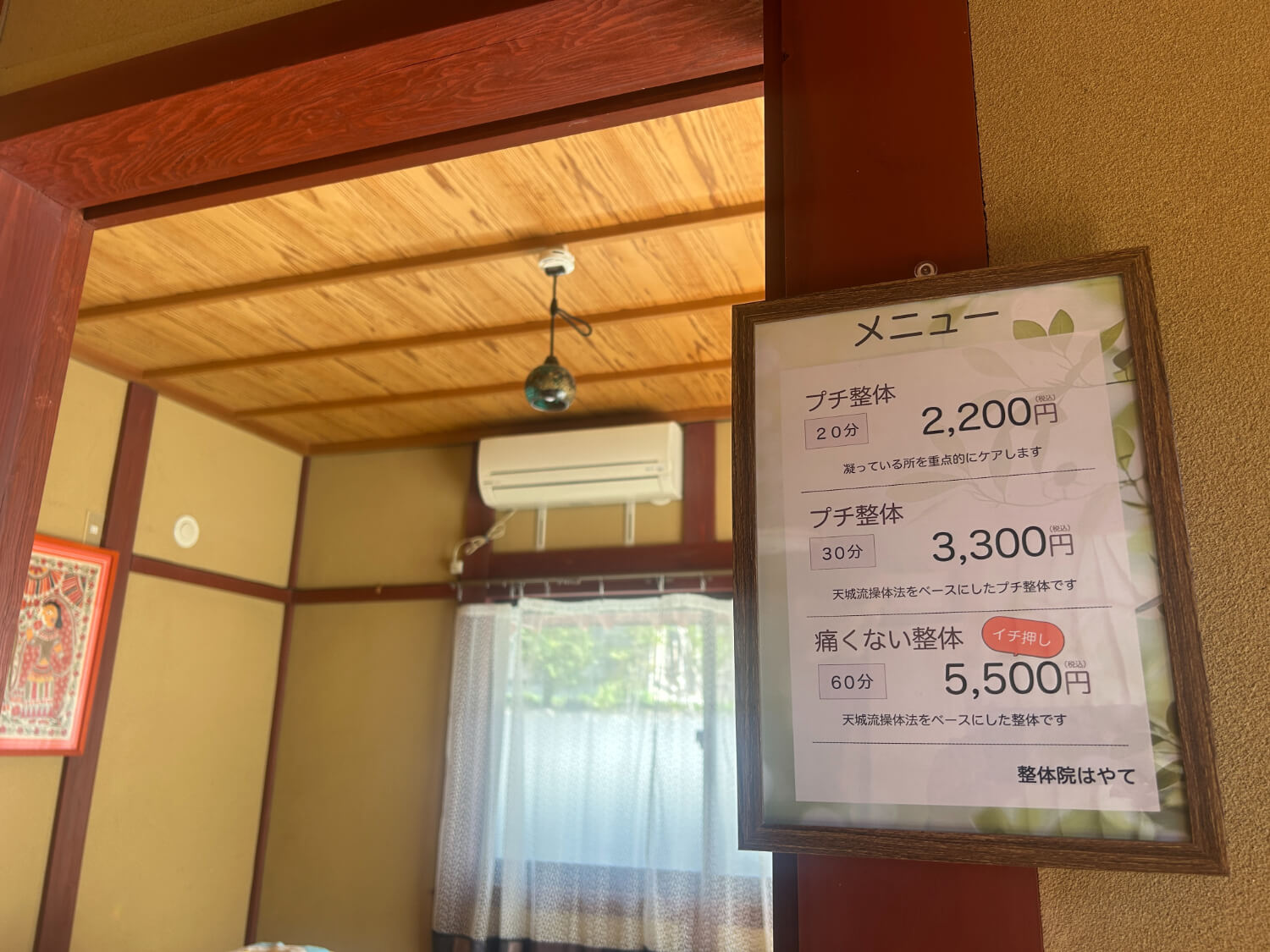 床を貼り替えて、清潔感と温かみのある施術室の完成。柱のべんがらがいい感じです。